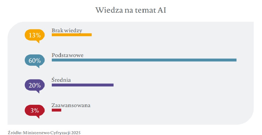 - 3 proc. ankietowanych deklaruje zaawansowaną znajomość AI,