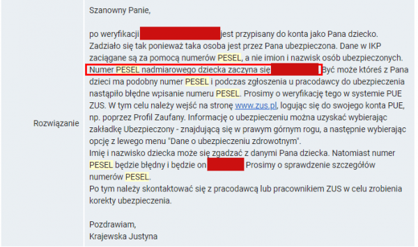 Po napisaniu do ZUS-u okazało się, że trzeba w tej sprawie kontaktować się z NFZ. Nie wiadomo dlaczego Ministerstwo Zdrowia i NFZ nie rozwiązało sprawy wewnętrznie, skoro serwis Pacjent.gov.pl jest ich wspólnym dziełem. Wszystko zostało przerzucone na obywatele i od niego zależało dalsze wyjaśnianie sprawy.