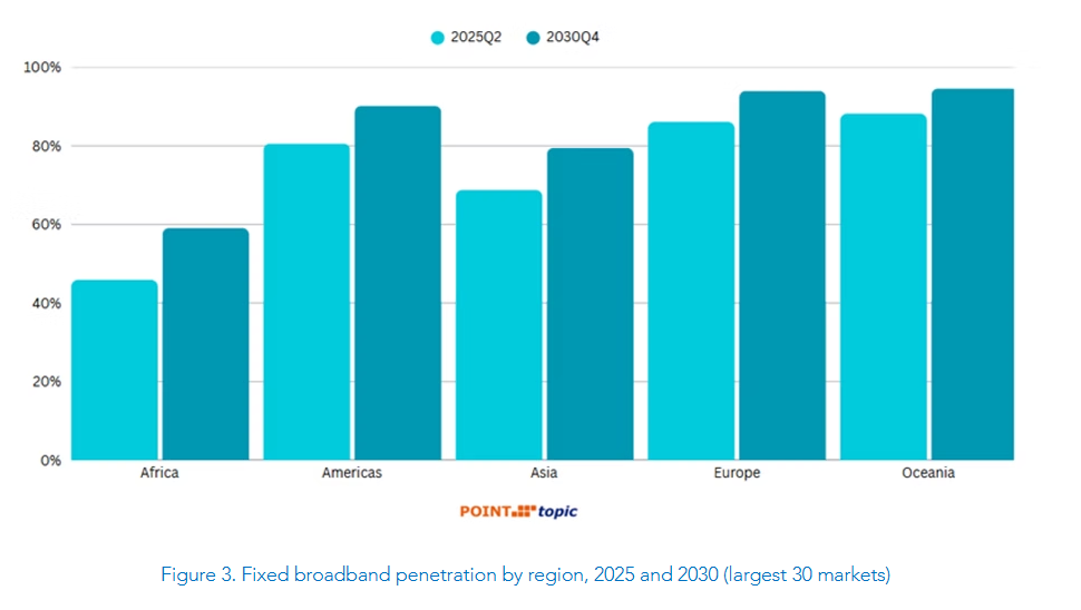 Raport pokazuje także wyraźne różnice regionalne. Afryka, mimo nadal ograniczonej infrastruktury stacjonarnej, zanotuje największy wzrost penetracji internetu stacjonarnego i do 2030 roku osiągnie poziom blisko 60 proc. W Amerykach penetracja sięgnie około 90 proc., w Azji niemal 80 proc., natomiast Europa i Oceania znajdą się w połowie dziewiątej dekady, zbliżając się do poziomu nasycenia.
