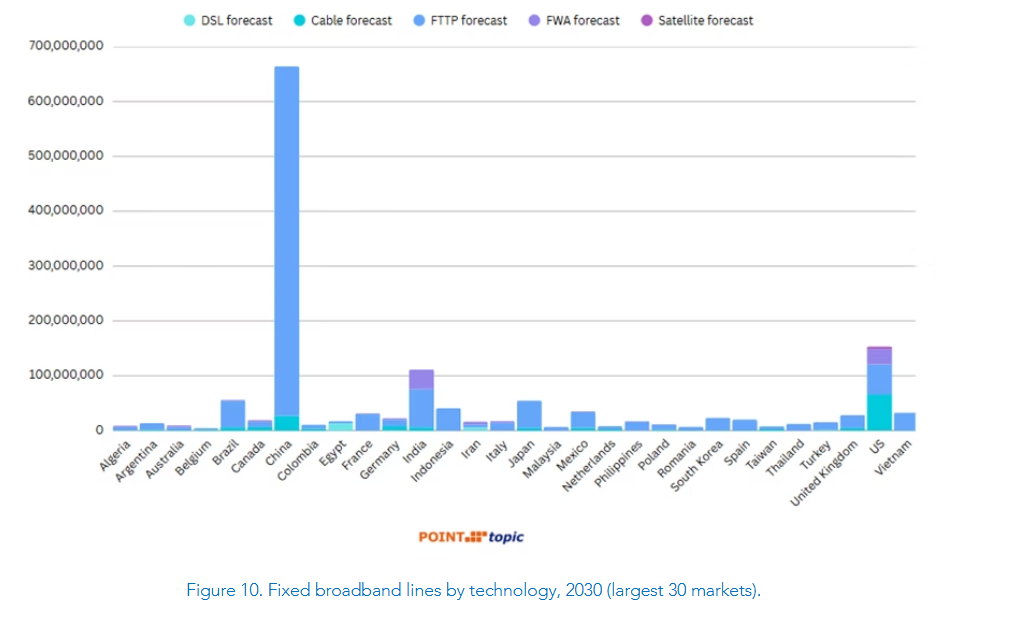 Największymi rynkami szerokopasmowego internetu pozostaną Chiny, Stany Zjednoczone, Indie, Brazylia i Japonia. To właśnie Chiny, Wietnam, Hiszpania i Korea Południowa mają osiągnąć najwyższy poziom penetracji FTTP. W krajach rozwiniętych dalszy wzrost liczby abonentów będzie coraz trudniejszy, dlatego operatorzy będą koncentrować się na migracji klientów do wyższych prędkości i bardziej konkurencyjnych ofert.