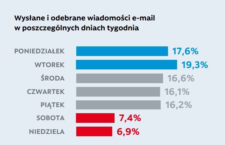 Interesująco wygląda też badanie dotyczące częstotliwości obsługi poczty w przebiegu tygodnia. Najwięcej maili przedsiębiorcy i ich pracownicy wysyłają i odbierają na początku tygodnia. Kulminacja następuje we wtorek. Wtedy odbywa się 19,3 proc. zadań z obsługą poczty związanych.