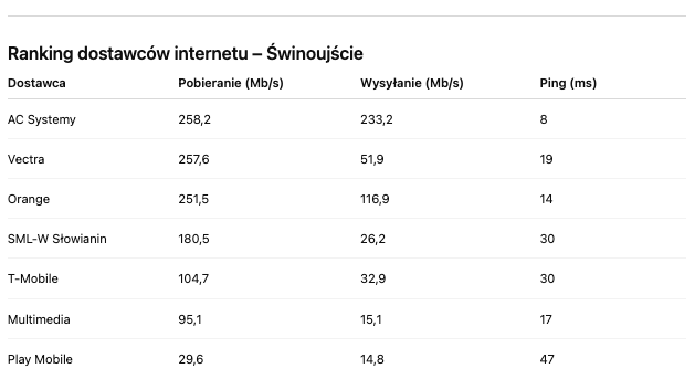 Platforma SpeedTest.pl opublikowała najnowszy ranking prędkości internetu domowego w Świnoujściu. Zestawienie powstało na podstawie rzeczywistych testów wykonywanych przez użytkowników w mieście i obejmuje trzy kluczowe parametry: prędkość pobierania danych, prędkość wysyłania oraz opóźnienie.