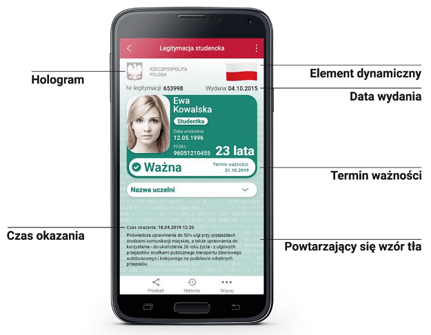 Żeby w pełni korzystać z mLegitymacji należy ją aktywować i zweryfikować znajdujące się na niej dane. Na mLegitymacji znajdują się takie informacje jak data wydania legitymacji oraz termin jej ważności. W dokumencie elektronicznym ważność legitymacji oznaczana jest też za pomocą koloru. Jeśli legitymacja jest ważna to oznaczenie będzie zielone. W przypadku nieważności legitymacji informacja wyświetla się na czerwono.