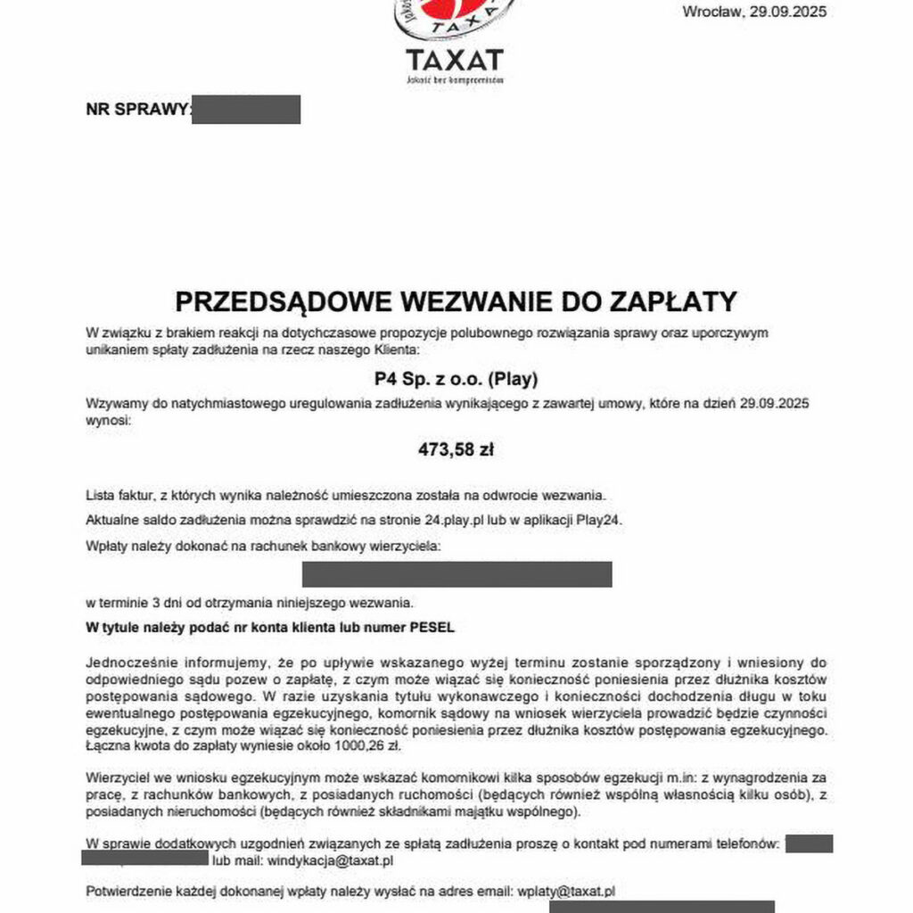 Klientka poprosiła o przesłanie zaległych faktur na jej poprawny adres. I je otrzymała, ale z dużym opóźnieniem. Play zażądał też jednorazowej wpłaty całej sumy. Oczywiście pani Paulina chciała rozłożyć dług na raty lub rozpoczęcia wysyłania faktur od nowa. Na takie rozwiązanie operator nie chciał się zgodzić.