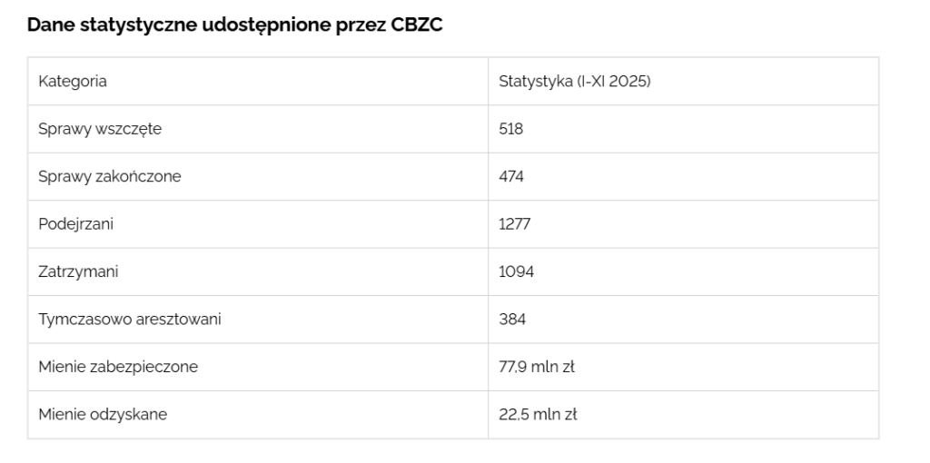 Komisarz Marcin Zagórski, rzecznik prasowy CBZC, przekazał dane dotyczące działalności w okresie od stycznia do listopada 2025 r.